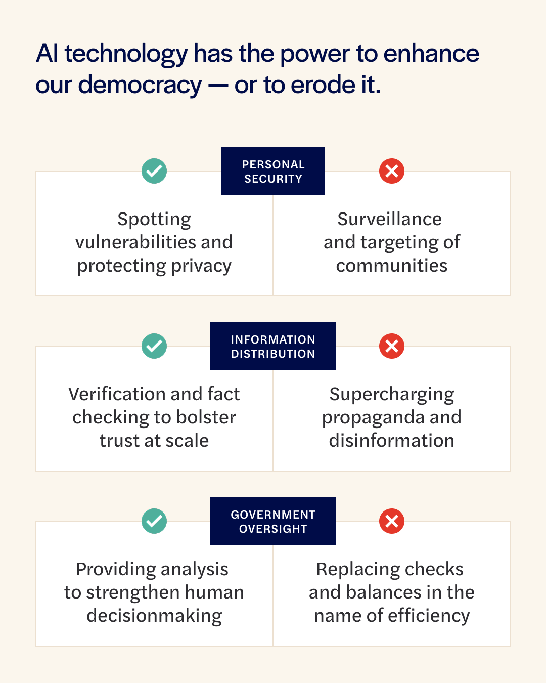 Conversely, in the best uses, AI can be deployed not to eliminate checks-and-balances and human decision making, but rather to strengthen them — equipping people with better tools to digest and analyze information and render careful judgment. Not only does that bolster democracy by effectively strengthening institutional resilience to top-down coercion, but it could actually facilitate efficiency gains and more informed decisions.
