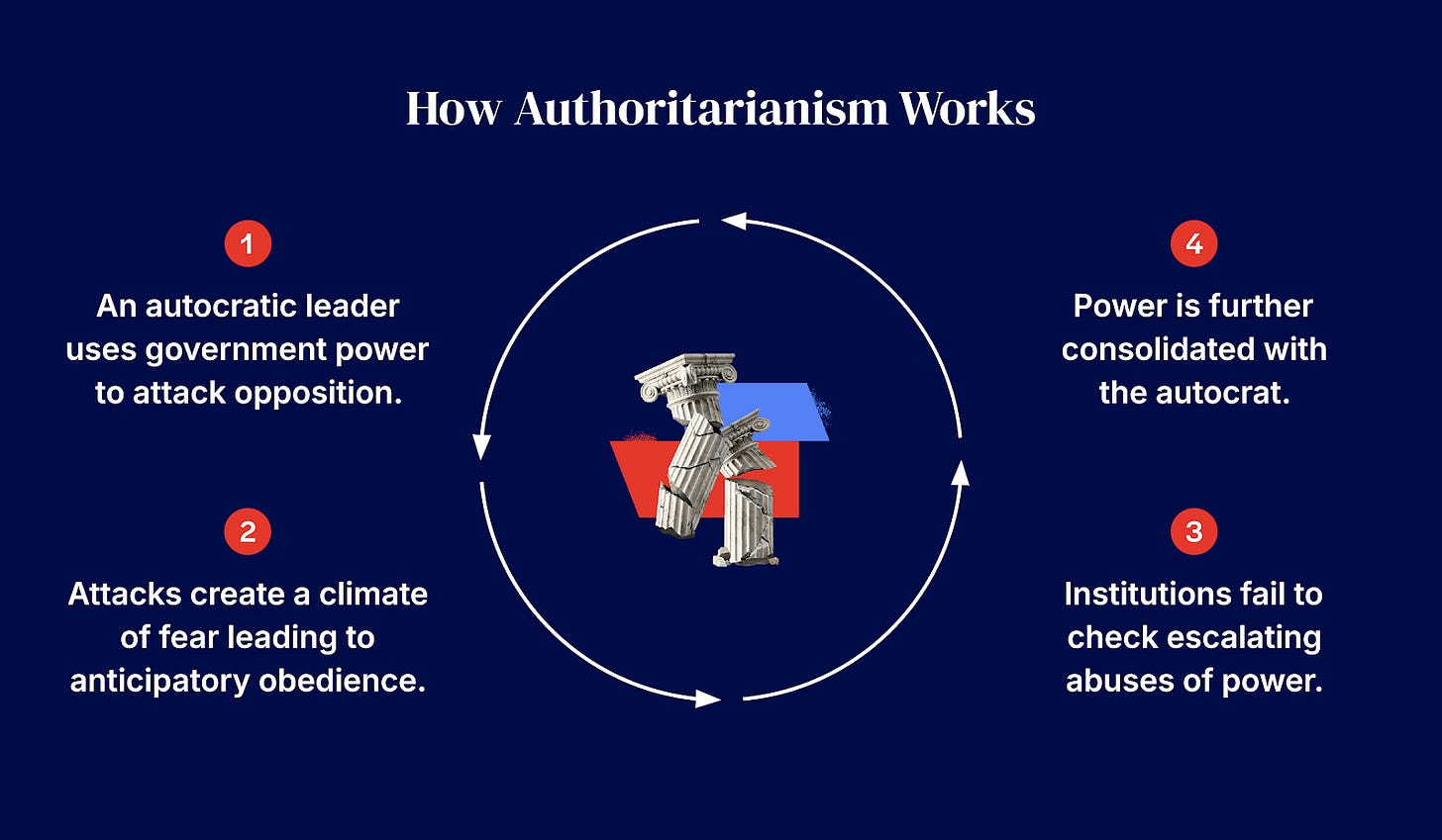 That misdirection is part of a larger effort. Authoritarianism works through a cycle of fear and acquiescence. One by one, would-be dictators convince everyone who would stand in their way to voluntarily surrender. To obey in advance.