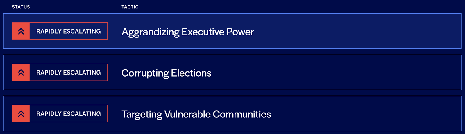 To generate that snapshot, we rely on the Authoritarian Playbook, which describes the seven tactics authoritarians rely on all over the world to consolidate and hold power. For each of these tactics, Protect Democracy’s experts analyze events in the news, and determine what they mean for the trajectory of American democracy.