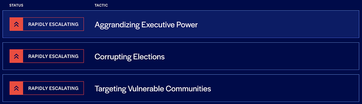 Even for those of us whose work involves following government and democracy, it can be difficult to keep up with every development. When people can’t keep track of what’s happening and what it means for the things they care about, they’re more likely to throw up their hands in defeat. Modern authoritarians don’t want us to be able to understand the entirety of what’s happening to our democracy. That’s why they disguise their assaults in a flurry of actions, scandals, and outrages.