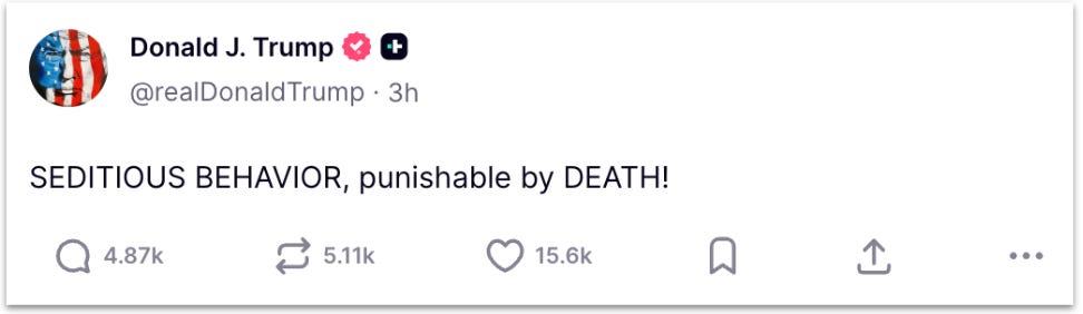 And yet what was the president’s response? He implied those members of Congress should be executed (and re-posted a call for them to be hanged).