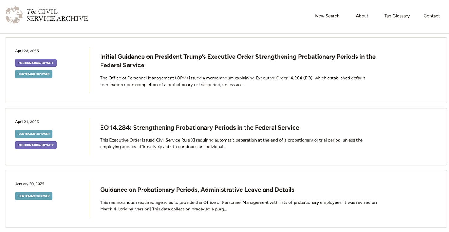 As you all know better than anyone, Schedule P/C is but one of the Trump administration’s many attacks on the civil service. To keep these attacks from getting buried and to be able to undo them when the day for rebuilding comes, we have built a new tool called the Civil Service Archive. The Archive captures each change to how the civil service works in order to educate the public and policymakers so they can understand those policies and to help spot trends or themes in what these changes do.
