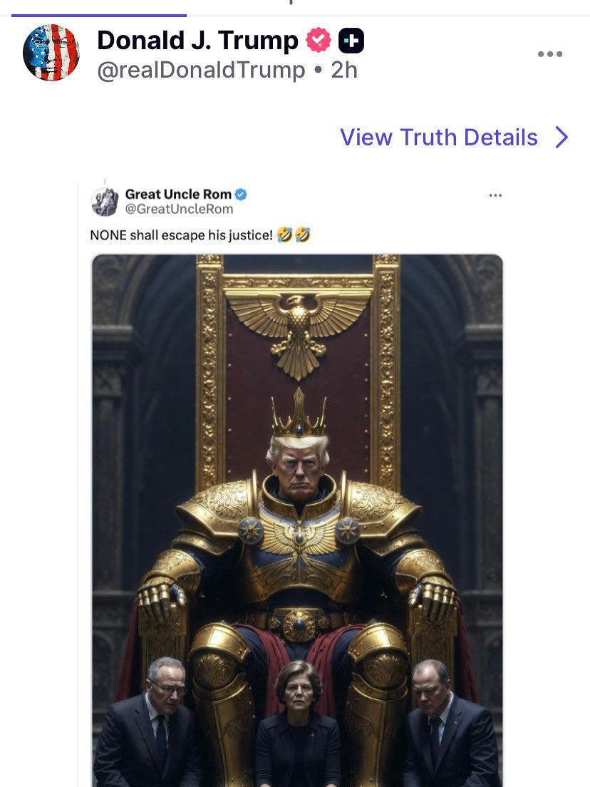 Over the weekend, the president posted an AI image of himself as a king in a golden crown and armor lording over three kneeling Democratic senators: Chuck Schumer, Elizabeth Warren, and Adam Schiff.